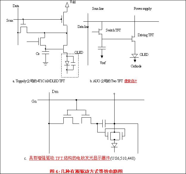 而LTPS所提供的TFT主动矩阵驱动以及驱动电路和TFT可同时整合制造,恰可维持轻薄化优势情形下并解决上述分辨率的问题。LTPS俨然变成横跨小尺寸LCD和OLED的共同必要技术,可以使2.5寸的面板具备200ppi的高分辨率。所以OLED的发展需要低温多晶硅强化其驱动电路[8]。 图 6为几种有源矩阵驱动方式的TFT结构图。